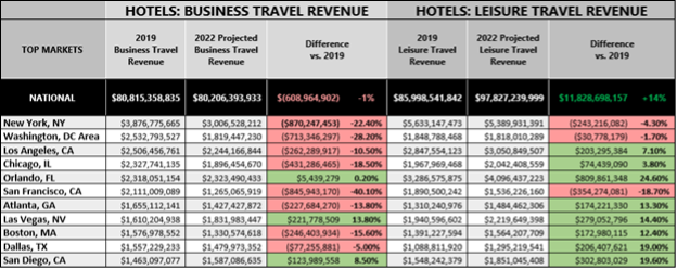 2022 hotel business travel revenue projected to be within 1% of 2019 levels; click here for a breakdown of top 50 markets