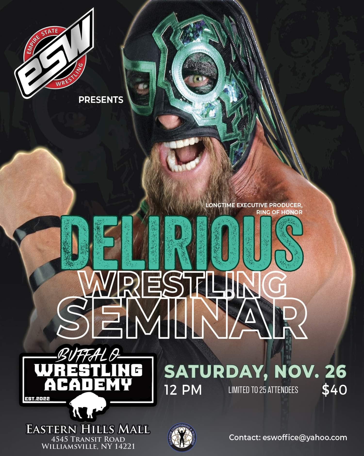 •ESW will host a wrestling training seminar the following day (Saturday, Nov. 26), conducted by Delirious at the Buffalo Wrestling Academy in Quantum Conditioning & Wellness within the Eastern Hills Mall in Williamsville. The seminar is open to current wrestlers and trainees who want to learn from one of the top trainers in the wrestling business, and gain exposure in front of ESW's staff for future booking consideration. For more information or to sign-up for the seminar, email eswoffice@yahoo.com.