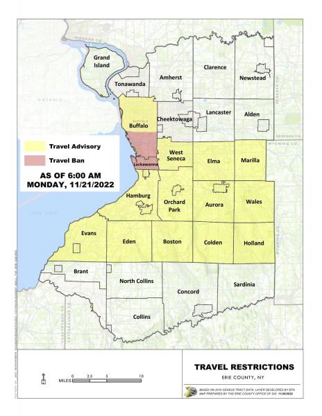 •Effective at 6 a.m., the travel ban for the Town of Evans and the Village of Angola will be lifted and replaced by a travel advisory for all of Evans
