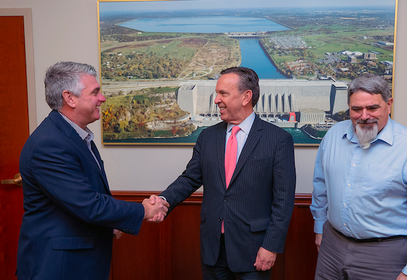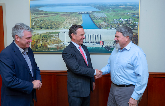 New York Power Authority Interim President and CEO Justin E. Driscoll (center) joins with IBEW Local 2104 Business Manager Lou Fazzolari, right, and IBEW Local 2032 Business Manager William Brown Jr. at a ceremonial signing of the new NYPA/IBEW five-year labor agreement. (Photo credit: New York Power Authority)