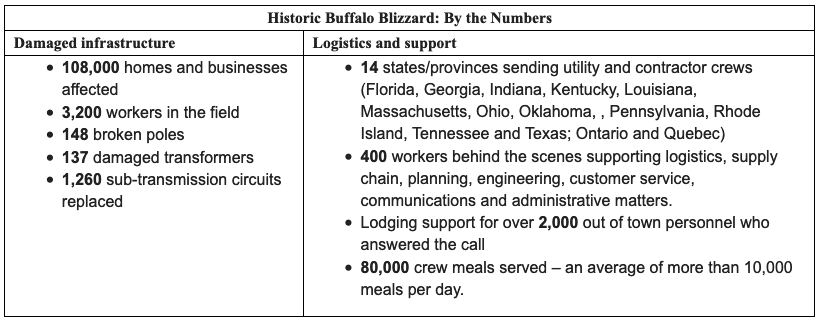 The destructive combination of sustained high winds and heavy snow caused significant damage to National Grid’s electricity system. The company’s massive field force, the largest in Western New York history, was assisted by a team of logistics experts who ensured crews had the resources and accommodations they needed to deliver for our customers.