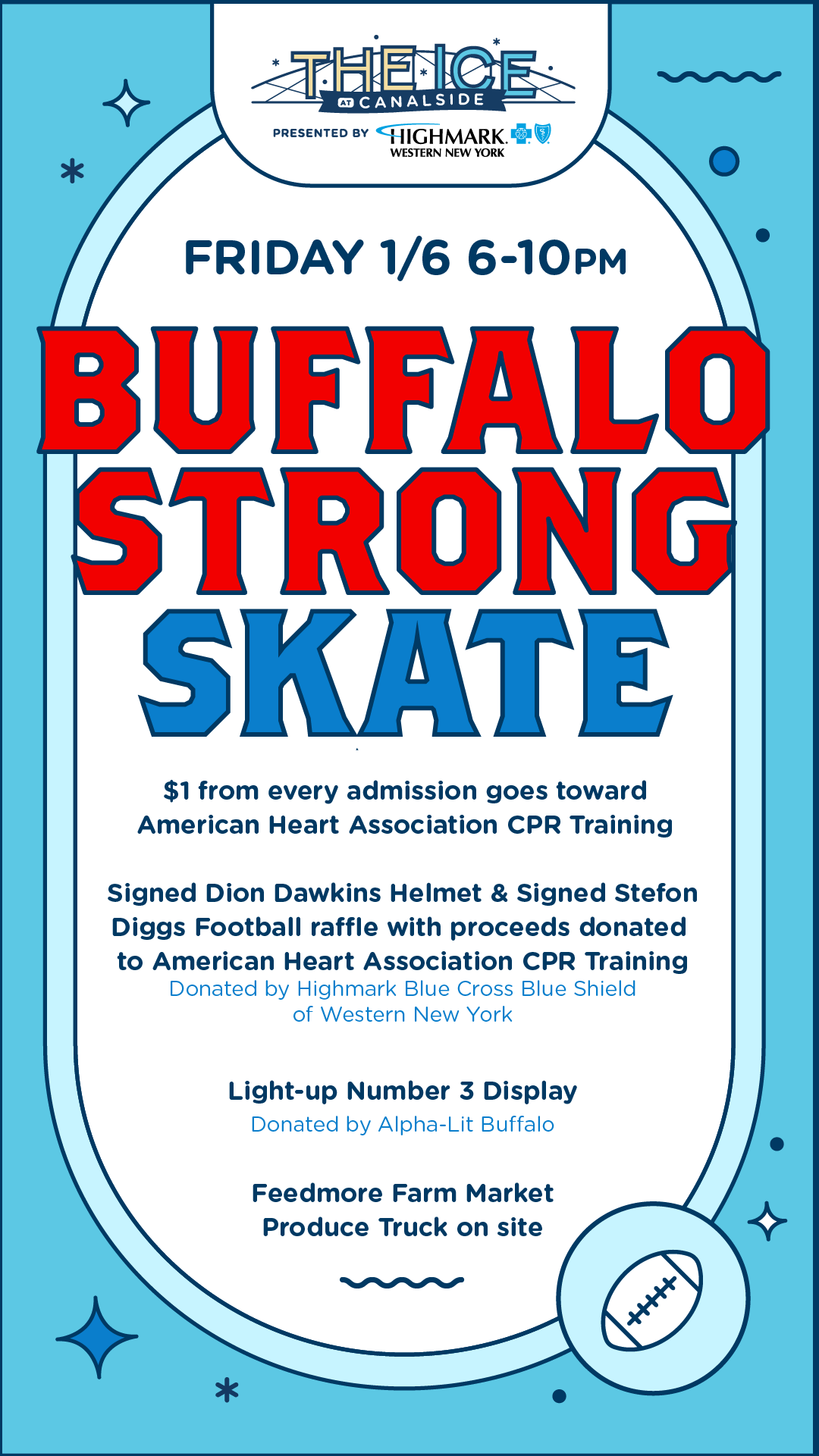 The Ice at Canalside will welcome skaters back by hosting a “Buffalo Strong” skate from 6-10 p.m. The event will raise money for the American Heart Association to support CPR training in response to both the lives lost to cardiac events during the blizzard and Damar Hamlin’s cardiac event during Monday night’s Buffalo Bills game. $1 of every admission ticket sold will be donated to the association, along with funds raised from the raffles of a signed Dion Dawkins helmet and signed Stefon Diggs football. Both items have been donated by Highmark Blue Cross Blue Shield of Western New York.