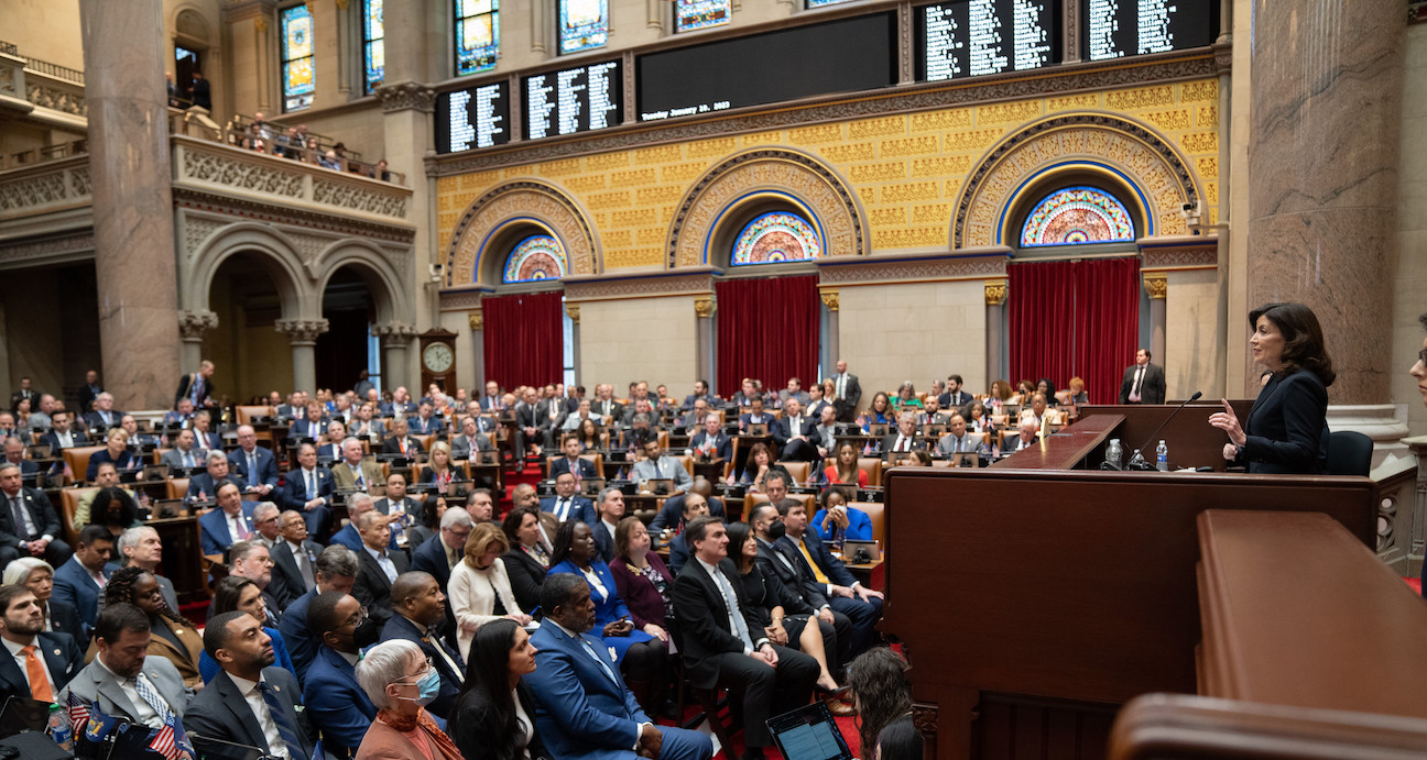Gov. Kathy Hochul delivers her 2023 State of the State address in the Assembly Chamber at the State Capitol. (Photo by Don Pollard/Office of Gov. Kathy Hochul)