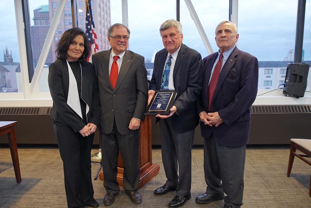 In February 2018, Joan Wolfgang – Jerry’s wife, and the second-longest-serving member of the Niagara County Community College board of trustees – was honored posthumously for her dedicated work at NCCC. From left: Gina I. Virtuoso, Dr. William Murabito, Jerald I. Wolfgang and William L. Ross. (Submitted)
