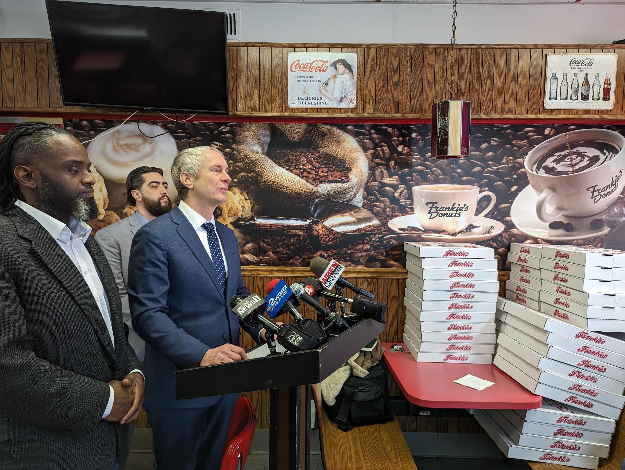 New York State Sen. Sean Ryan speaks at an appearance inside Frankie’s Donuts. (Submitted photo)
