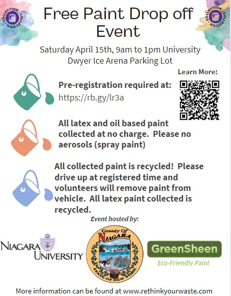 Niagara County Legislature Chairman Becky Wydysh announced Niagara County is partnering with Niagara University and GreenSheen to host a paint recycling event on Saturday, April 15. Any latex or oil-based paint in its original container can be accepted at no cost. Residents and businesses are allowed to bring up to 50 gallons of paint to the event.