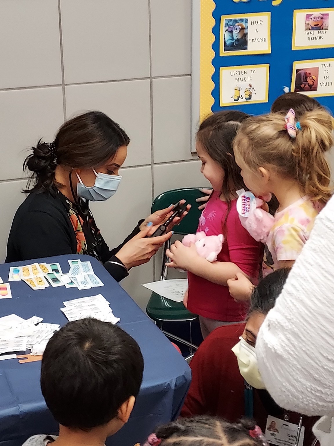 As part of the clinic, NFMMC's residents set up four interactive stations to teach the students about various aspects of health care. At one station, students learned how to measure their teddy bears' vital signs, including blood pressure and pulse rate, using equipment such as stethoscopes and pulse oximeters. At another station, students learned the importance of good hygiene and how to correctly cough or blow their noses. The third station focused on nutrition and healthy eating habits, while the final station taught students basic first aid skills and how to treat teddy bear "boo-boos."