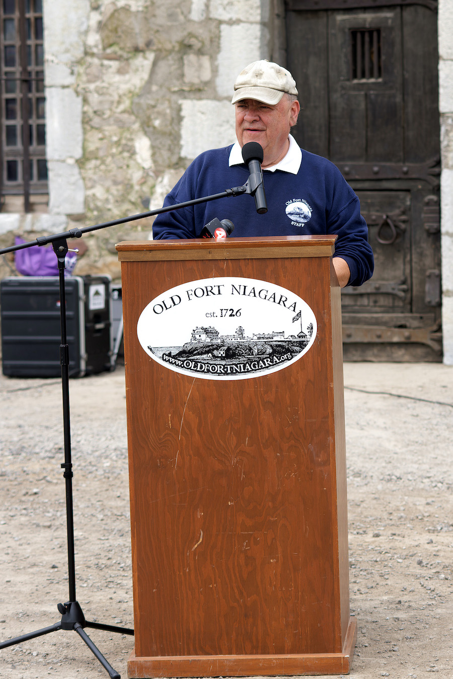 The new castle roof of Alaskan Yellow Cedar was dedicated Friday, June 9, at Old Fort Niagara in Youngstown. New York State Parks Niagara Region Director Mark Mistretta was on hand to talk about this badly needed project, which also included repairs to eight chimneys. Instead of a ribbon-cutting, after OFN Executive Director Robert Emerson thanked all the local dignitaries in attendance, a cannon was fired. Pictured: The French Castle with local dignitaries and the construction crew who did the work in front of it. • Emerson at the microphone. • A cannon is fired. (Photos by Wayne Peters)