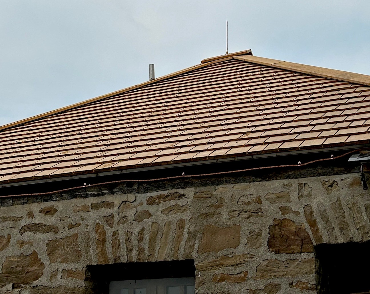 Associated work includes masonry repair and repointing of all chimneys, and installation of new chimney caps. The last roof on the French Castle was installed in the 1990s.