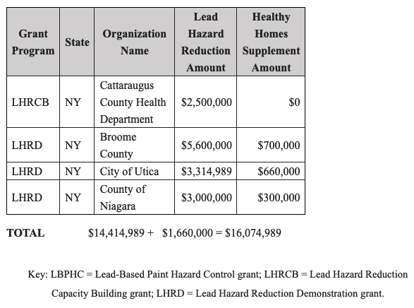 HUD awarded $14,414,989 in Lead Hazard Reduction Grant Program funding and $1,660,000 in Healthy Homes Supplemental funding to the Cattaraugus County Health Department, Broome County, the City of Utica, and Niagara County, totaling $16,074,989.