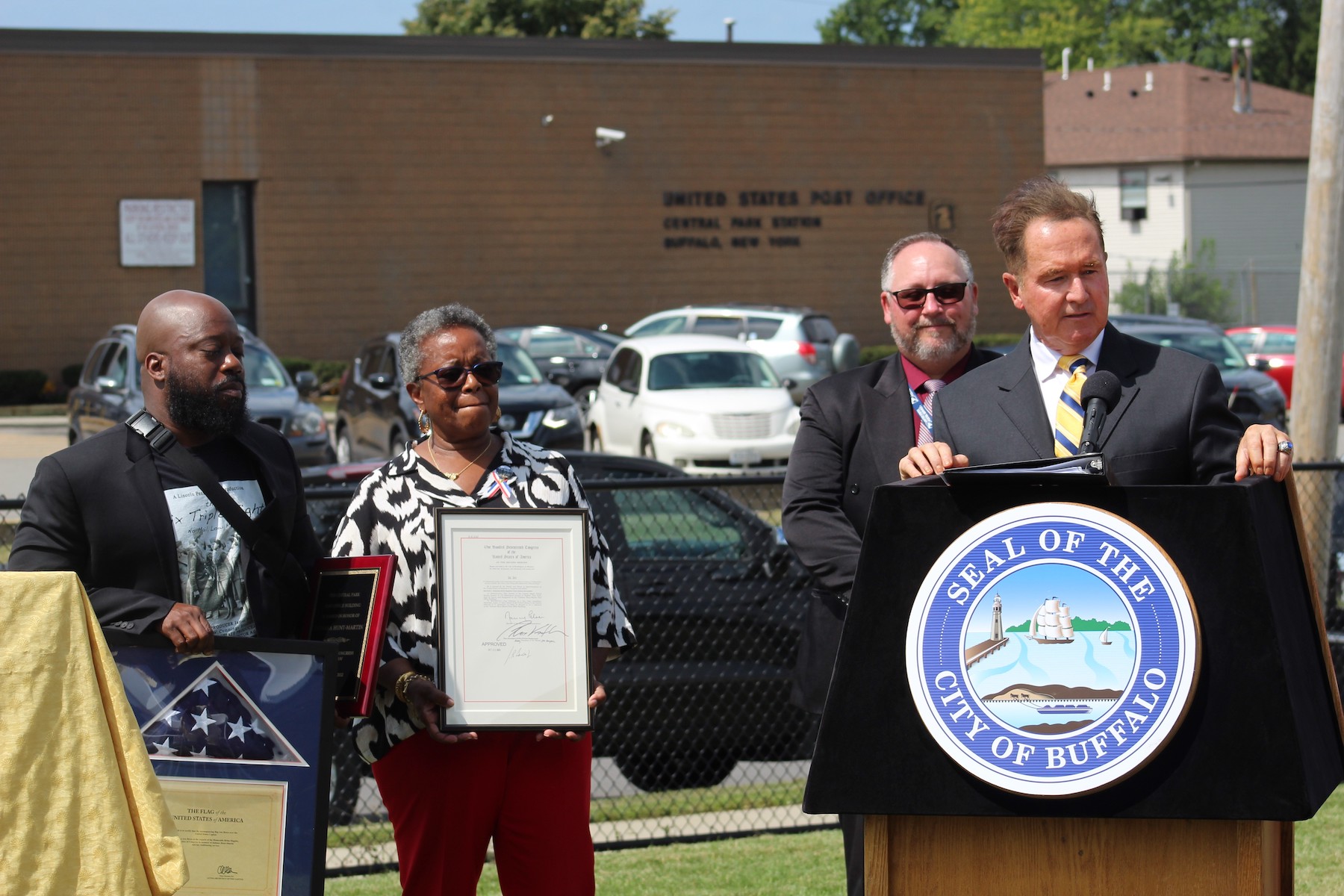 Congressman Brian Higgins on Monday joined the U.S. Postal Service and Western New York community in a ceremony officially renaming the Buffalo post office, at 170 Manhattan Ave., the Indiana Hunt-Martin Post Office Building.