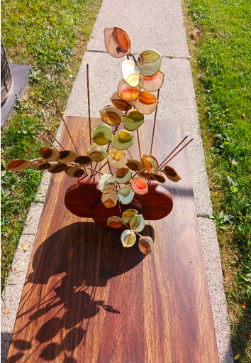 The first illustration is a piece of artwork. Its location was DeVeaux. The artwork included three wooden vases, which had mini triangles drawn on them. The metal attached to the wood represented leaves and branches. However, the wooden table that the artwork sat on was a piece of fine furniture.