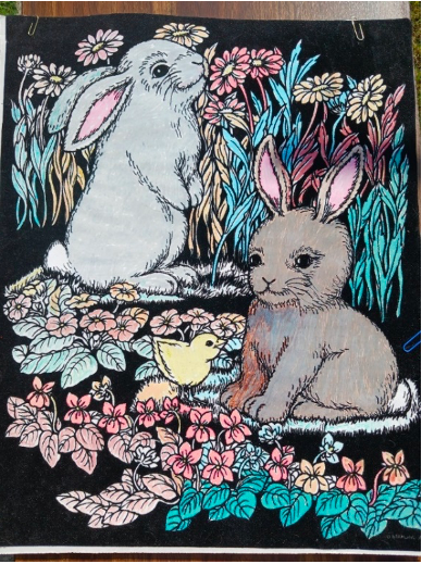 The third illustration is artwork. Its location was Pine Avenue. The colorful rabbits were spotted in a flower garden. This picture was made of velvet, which symbolized goodness for the neighborhood.