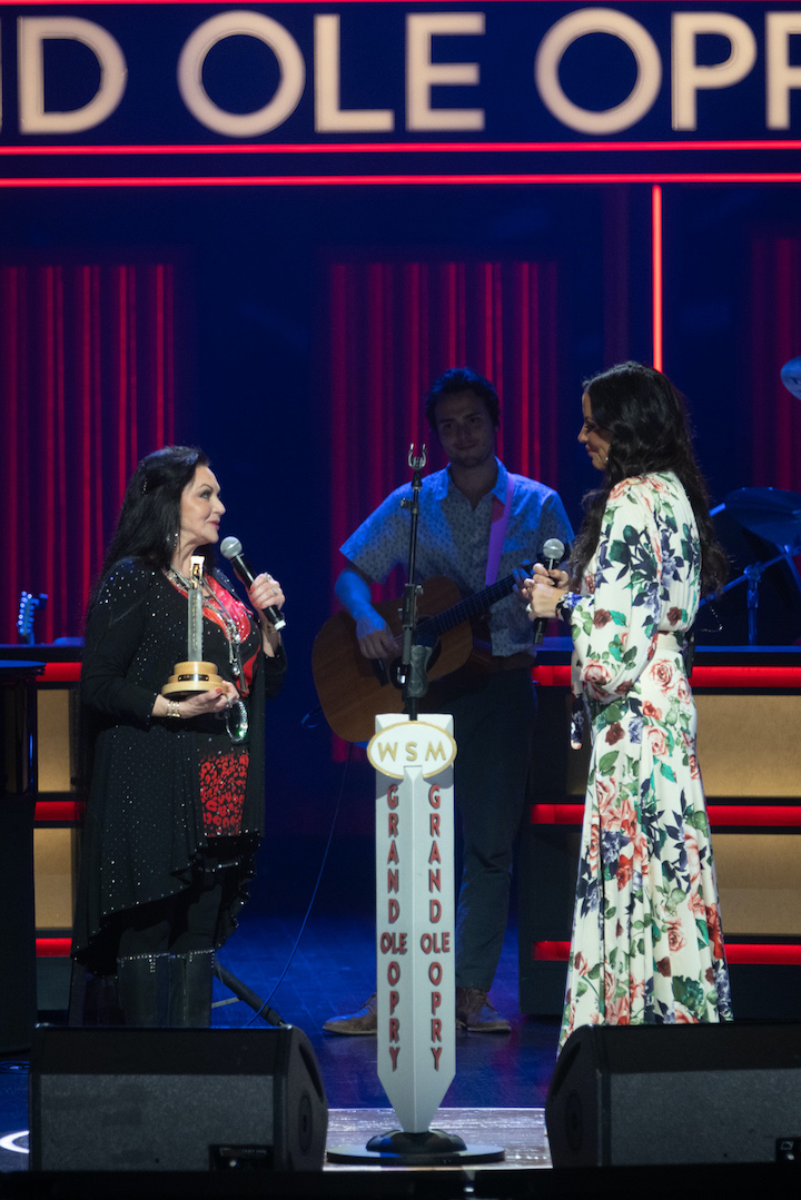 Crystal Gayle welcomes Sara Evans in to the Grand Ole Opry family. (Photo by Chris Hollo// provided by Schmidt Relations)