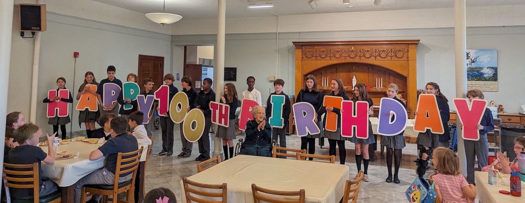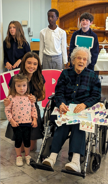 The school celebrated by singing “Happy Birthday” to Sister Joan while the youngest students, twin sisters Madeline and Josephine, presented cards made by the students with their prayer partners, twin sisters Emily and Sophie. In a small twist of fate, Oct. 20 was also Emily and Sophie’s birthday, and they are the oldest students at the school.