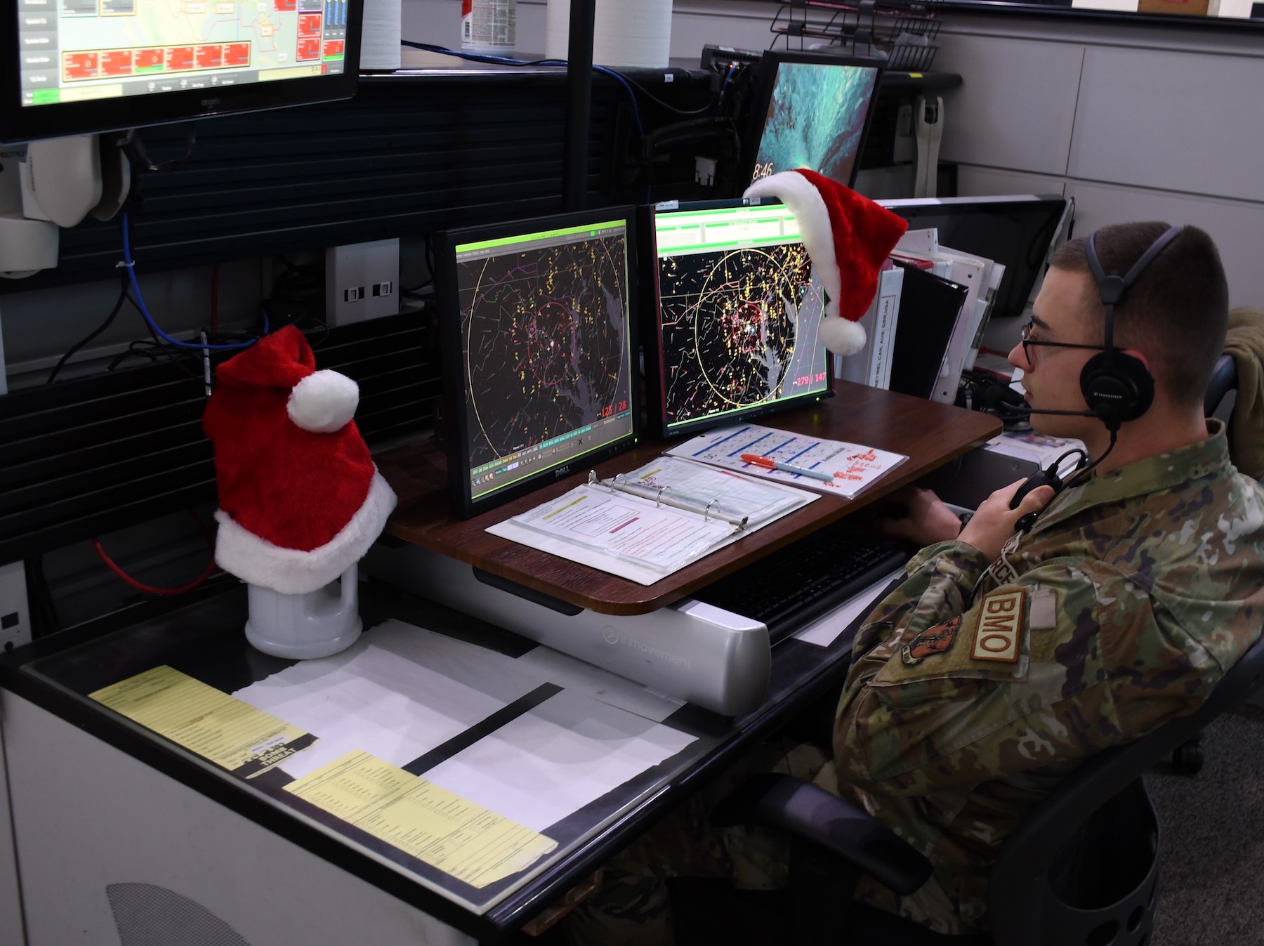 Airman 1st Class Kyle Larsen, a member of the New York Air National Guard assigned to the Eastern Air Defense Sector in Rome, New York, keeps an eye on the sky over the eastern U.S. while preparing for Christmas Eve, when the sector's airmen will help in the annual “NORAD Tracks Santa” effort to get St. Nick to his destinations safely. (U.S. Air Force photo by Patrick Young)