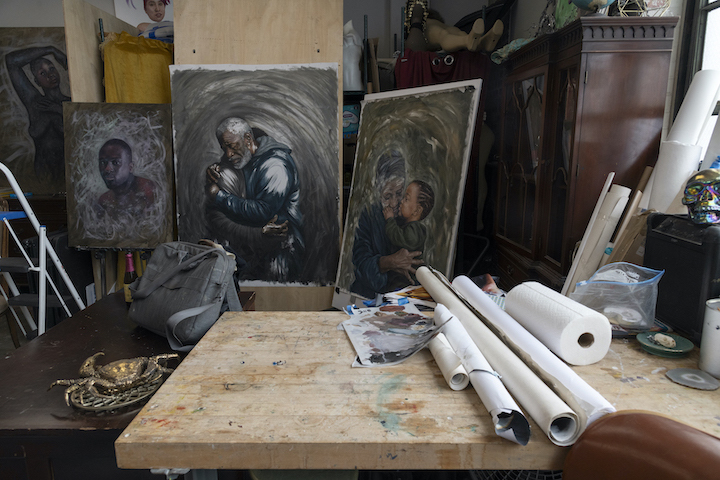Julia Bottoms' studio while at work on the paintings for “Before and After Again.” (Photo: Amanda Smith for the Buffalo AKG Art Museum)