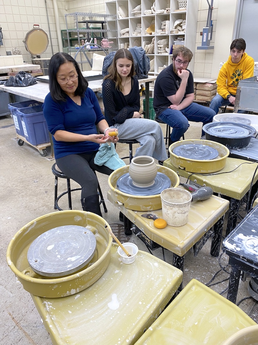 Ceramic artist Junko McGee demonstrates wheel-throwing techniques for students Summer Johnson, Owen Galbraith and Elijah Veltri. (Submitted photo)