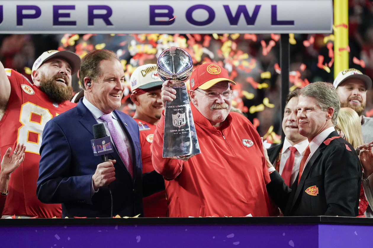 Super Bowl LVIII on Sunday, Feb. 11, at Allegiant Stadium in Las Vegas. Pictured, from left: Travis Kelce, Jim Nantz, Andy Reid and Clark Hunt. (Photo by Mary Kouw /CBS ©2024 CBS Broadcasting Inc.; all rights reserved)