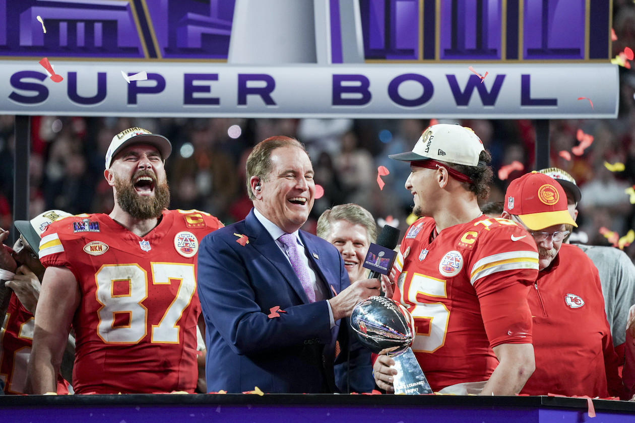 Super Bowl LVIII on Sunday, Feb. 11, at Allegiant Stadium in Las Vegas. Pictured, from left: Travis Kelce, Jim Nantz and Patrick Mahomes. (Photo by Gail Schulman/CBS ©2024 CBS Broadcasting Inc.; all rights reserved)