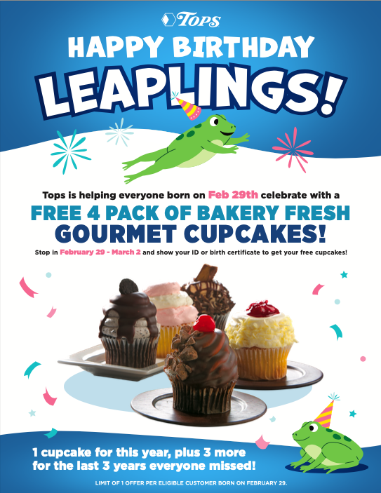 From Feb. 29-March 2, Tops invites anyone born on Feb. 29 to bring in their ID or birth certificate to receive one free four pack of Tops gourmet cupcakes – one for your birthday this year, and one for each birthday you missed.