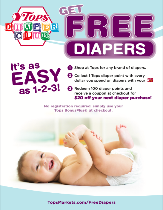 At Tops, we have everything you need to help provide for your new baby: from diapers and formula to pacifiers and baby wipes. We even have the “Tops Diaper Club” to help you save as you raise your little one. For every $1 you spend on any brand of diapers, you automatically receive 1 diaper point. Collect 100 diaper points and receive a coupon at checkout for $20 off your next diaper purchase. No registration is required; just simply use your Tops BonusPlus Card.
