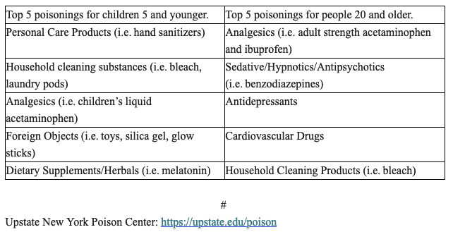 The Upstate New York Poison Center provides a variety of resources tailored for different needs, including child care centers, in-home safety, seasonal poisoning risks, how to dispose of medications safely, tips for medication safety, and specialized advice for older adults. It also offers guidance on food and mushroom safety, handling bites and stings, and keeping pets safe from poisons. Additionally, the center has created an online guide for teachers, offering training materials for those interested in teaching poison prevention. More information can be found at https://www.upstate.edu/poison/community/teachingtools.php.
