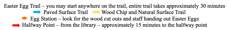 •10-11:30 a.m. – Indoor and outdoor activities. Travel outside along the Easter egg trail through Veterans Park. Egg locations will be marked with wooden Easter decorations, Recreation Department staff and volunteers. It will take approximately 30 minutes to walk the entire trail. Come any time between 10 and 11:30 a.m. – eggs will be available the entire time. You may start anywhere along the trail. No registration is required. The trail is paved and a natural surface. See trail map for more details.