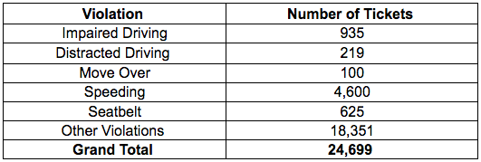 24,699 tickets issued statewide for various vehicle and traffic law violations, 935 tickets issued statewide for impaired driving