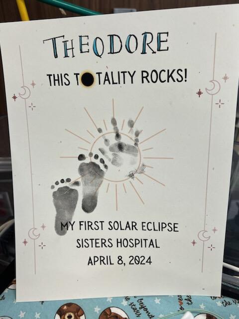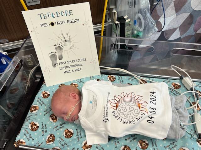 Babies born at Catholic Health’s Sisters of Charity Hospital and Mercy Hospital of Buffalo this past weekend and today, including Theodore and Vivian pictured here, are modeling the latest in solar eclipse baby gear, including a onesie that says, “Hello darkness my old friend.” (Catholic Health photos)