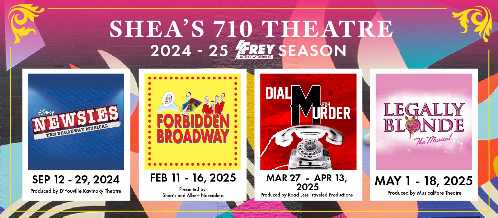 Shea’s Performing Arts Center is proud to announce the 2024-25 Frey Electric Season at Shea's 710 Theatre. The season opens during the Theatre District Association’s annual “Curtain Up” celebration and includes “Disney’s Newsies” produced by the D’Youville Kavinoky Theatre; ”Forbidden Broadway,” presented by Shea's and Albert Nocciolino; ”Dial M for Murder,” directed by Road Less Traveled Productions; and “Legally Blonde” produced by MusicalFare Theatre.