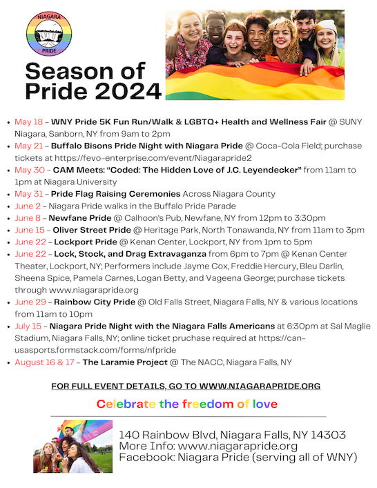 •Community-based Pride celebrations – Rainbow City (Niagara Falls) Pride (in partnership with Old Falls Street), Newfane Pride, North Tonawanda Pride (in partnership with the Oliver Street Merchants Association)!