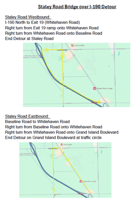 •Staley Road, westbound: I-190 north to Exit 19 (Whitehaven Road). Turn right from the Exit 19 ramp onto Whitehaven Road; make a right turn from Whitehaven onto Baseline Road and continue to the end of the detour at Staley Road.