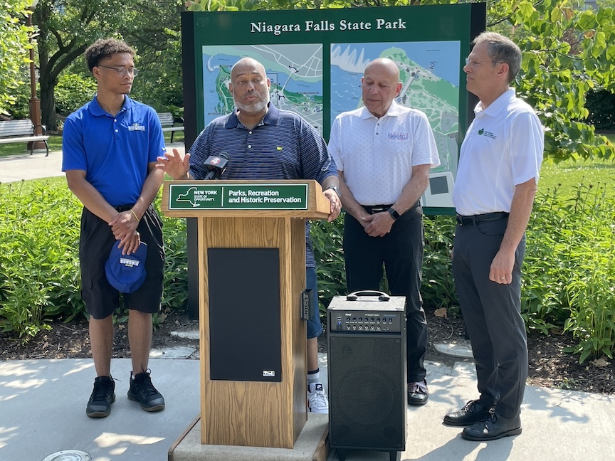 Jacob Fleming addresses the media. From left: Jacob Fleming Jr., Jacob Fleming, Assemblyman Angelo Morinello and New York State Parks Niagara Region Director Mark Mistretta.