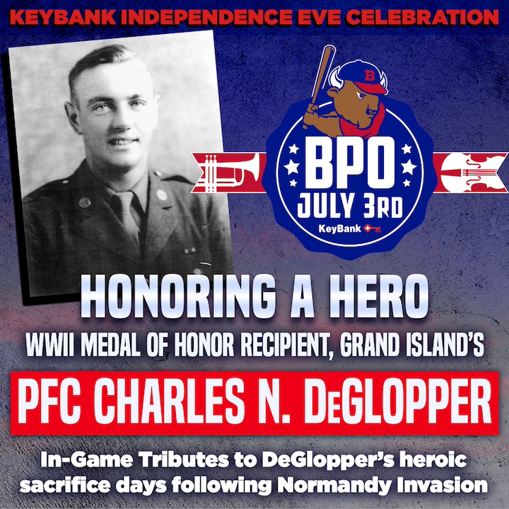 During the independence eve celebration game, the Bisons will also tell the story of PFC. Charles N. DeGlopper, a Grand Island native and member of the 325 Glider Infantry Regiment who courageously gave his life days after the Normandy invasion to protect the rest of his platoon as they were encircled by Axis troops. DeGlopper, who will be represented at the game by family members, is the only Medal of Honor recipient from the storied 82nd Airborne Division as part of the Normandy Campaign. During the Bisons game, the team will be selling handheld American Flags for a $5 donation toward the making of a documentary film telling DeGlopper’s heroic story (cash will be accepted for donations).
