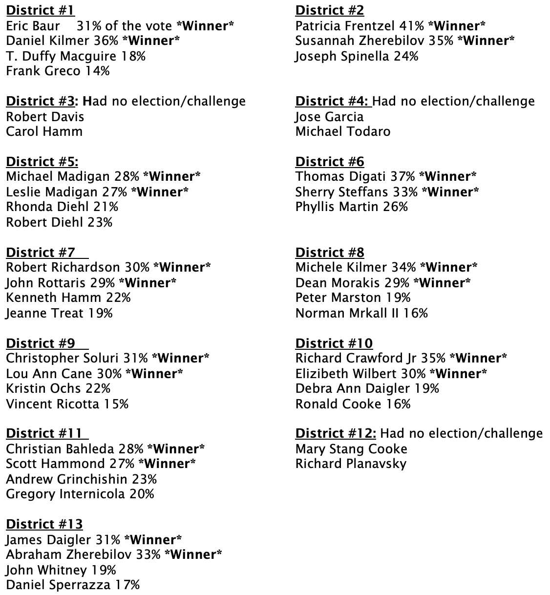 On June 25, the Republican Party held elections for 20 of its 26 Republican committee seats on Grand Island (there are two seats/election district for each party). Results are below: