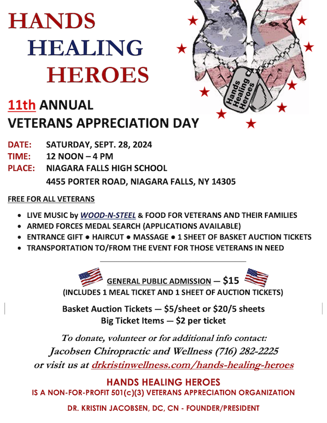 Niagara Falls High School will host a veterans appreciation day from noon-4 p.m. Saturday, Sept. 28, at the school, 4455 Porter Road. The event will feature free food and drink for all veterans and their families. Also Included will be music featuring the band Wood-n-Steel, plus a basket auction.