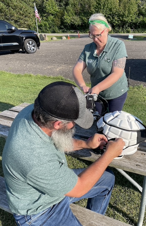Pictured, LPYF Commissioner Mike Wall and President Amy Wall are shown installing Guardian Caps ahead of a practice Tuesday night at Richard F. Soluri Field in Lewiston. Also pictured, before and after photos of the football helmets.