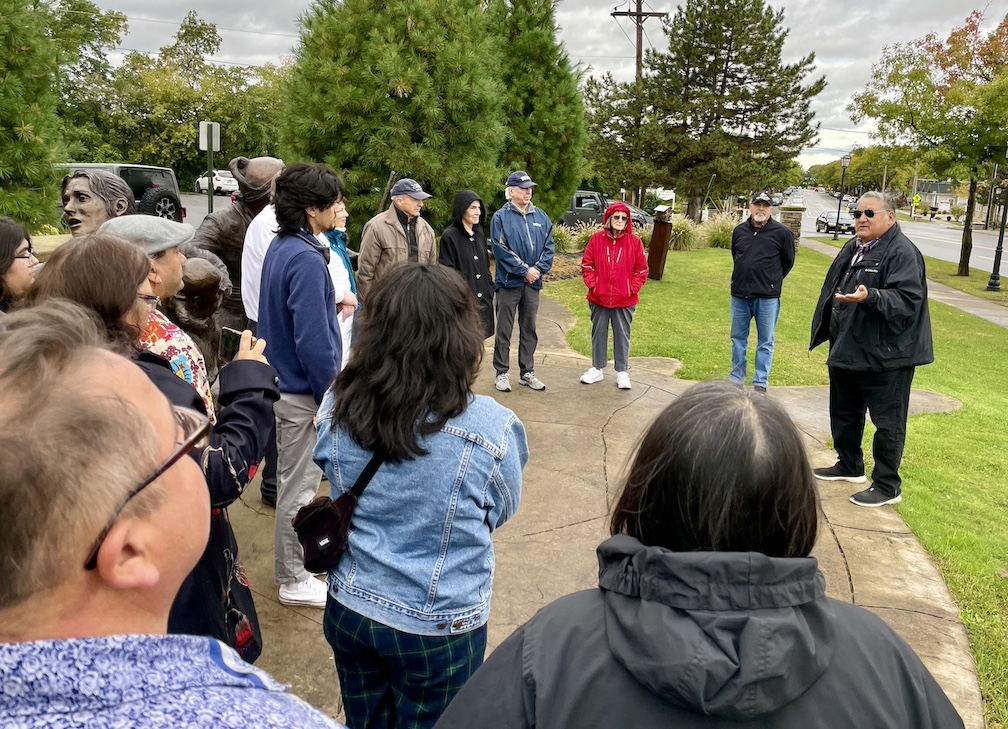 Kenyon Serpas, center, received a $750 Historical Association of Lewiston’s Indigenous Peoples' Day Scholarship while joined by family, friends, teachers and local volunteers.