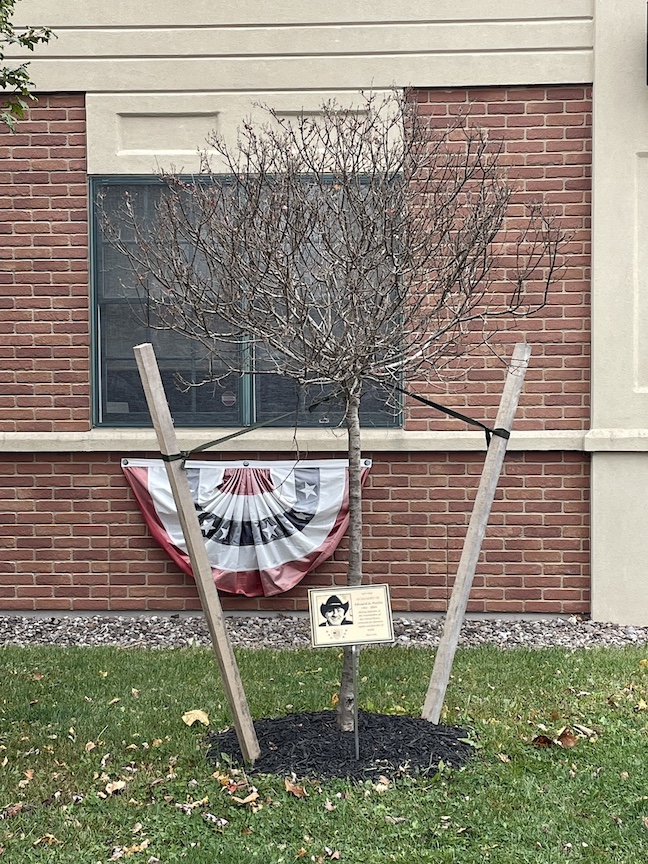 The lilac tree and plaque of Ed Pettitt Jr. in front of the Newfane Town Hall.