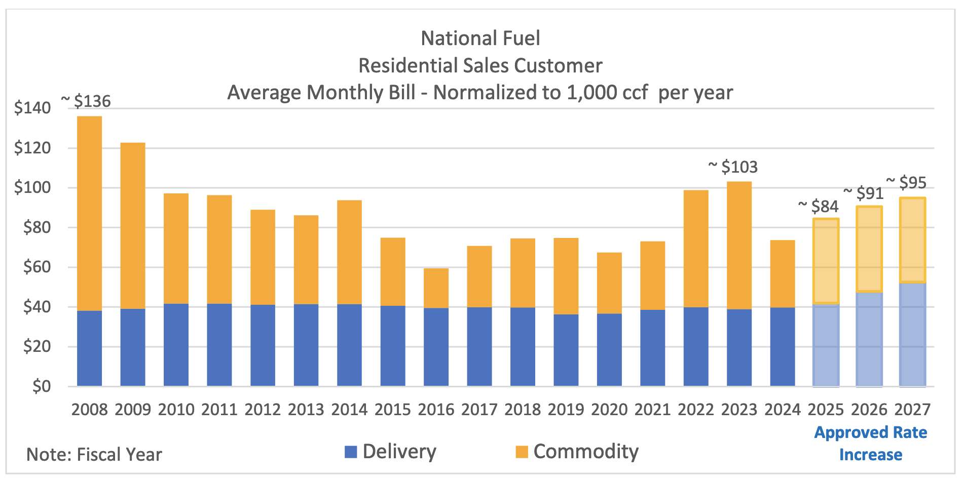 Residential customer bills will increase on average $5.97 per month, or 5.6%, on Jan. 1, 2025; $6.06 per month, or 7.2%, on Oct. 1, 2025; and $5.18 per month, or 5.8%, on Oct. 1, 2026. Currently, the average monthly bill of a typical residential customer using 102 thousand cubic feet of gas a year is approximately $80 per month. Even after the rate increase takes effect, National Fuel’s residential delivery rates will continue to be among the lowest for large natural gas utilities in New York state.