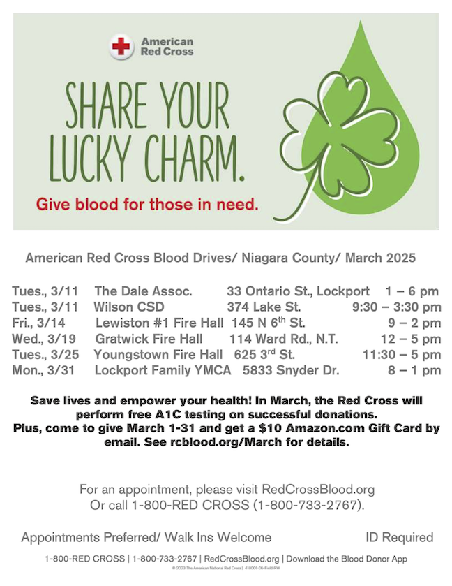 The American Red Cross has announced the following blood drives to be held this March in Niagara County: