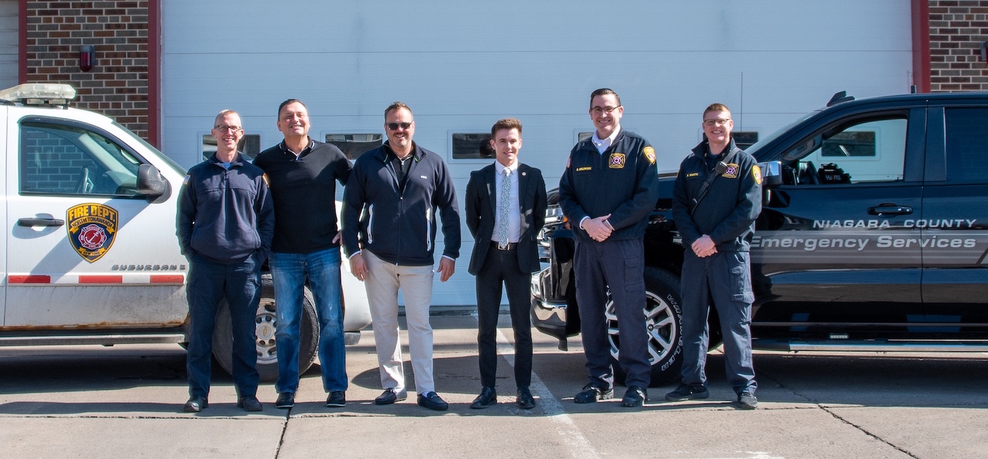 County Emergency Services Director Jon Schultz, legislators Randy Bradt and Jesse Gooch, Mayor Austin Tylec, NT Fire Chief Doug Orlowski and Deputy Chief Brandon Werth at North Tonawanda Fire Department headquarters on Zimmerman Street.