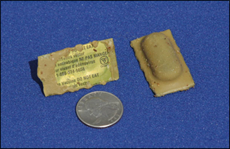 A. The ORV baits consist of a sachet, or plastic packet, containing the rabies vaccine. To make the baits attractive, the packets are sprinkled with a fishmeal coating or encased inside hard fishmeal-polymer blocks about the size of a matchbox. See Figure 2.