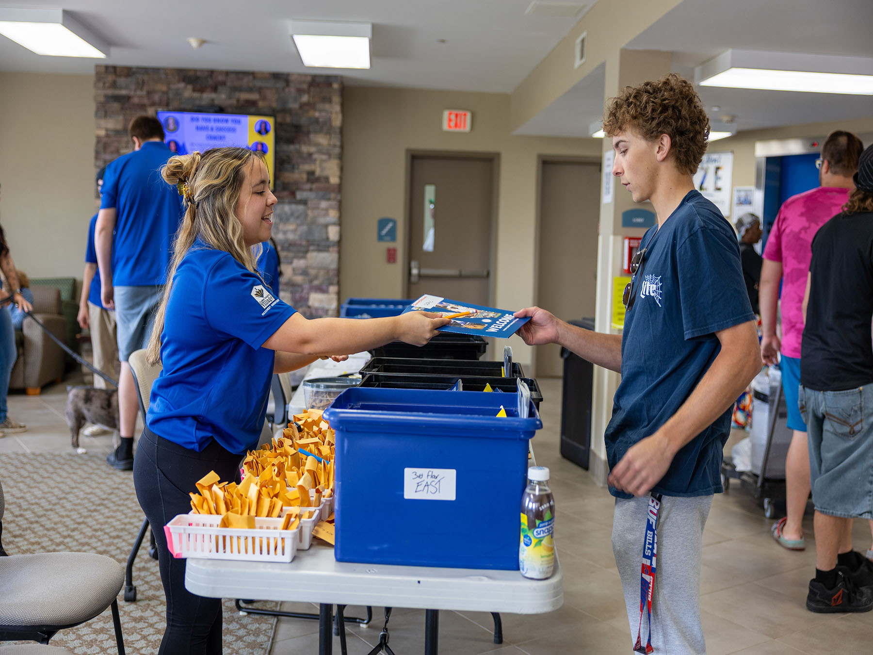 A SUNY Niagara student receives a welcome packet from a member of the Student Housing Village staff.