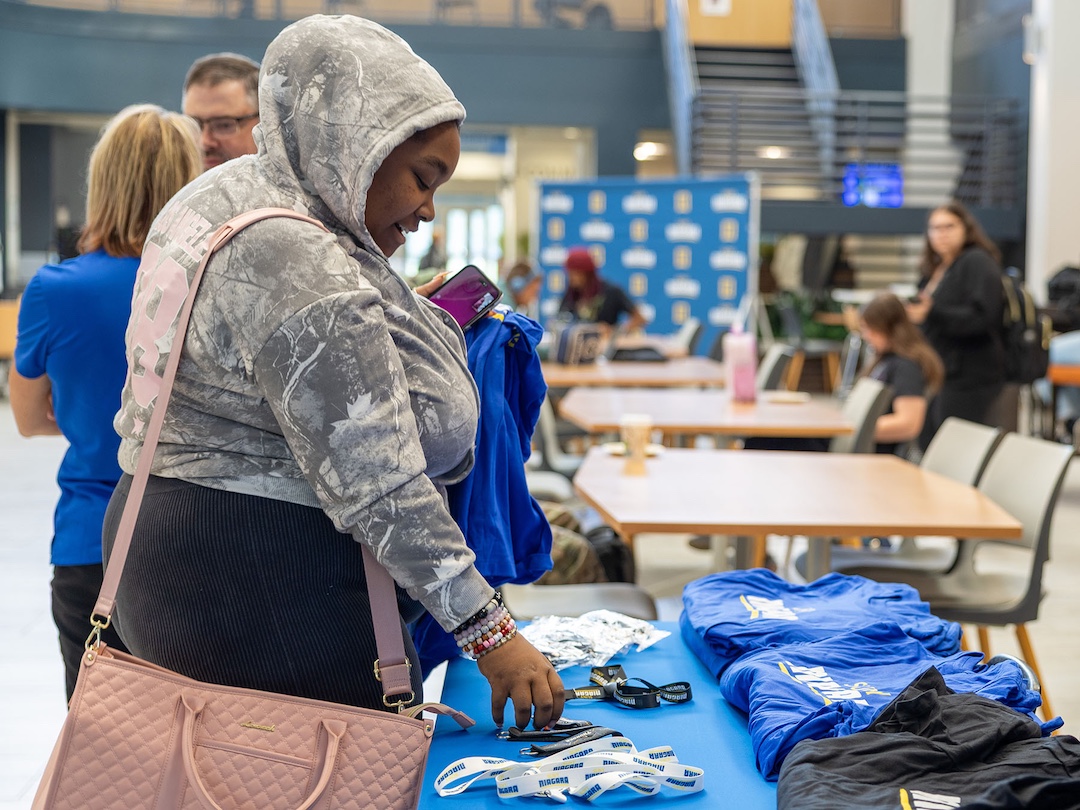 A new student picks up a SUNY Niagara T-shirt and lanyard at a welcome event in the college’s Learning Commons.
