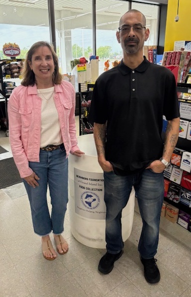 Mike Shine from the Grand Island Plaza Dollar General, and Cindy Kovacs of the Neighbors Foundation, are shown at the placement of the food donation barrel.