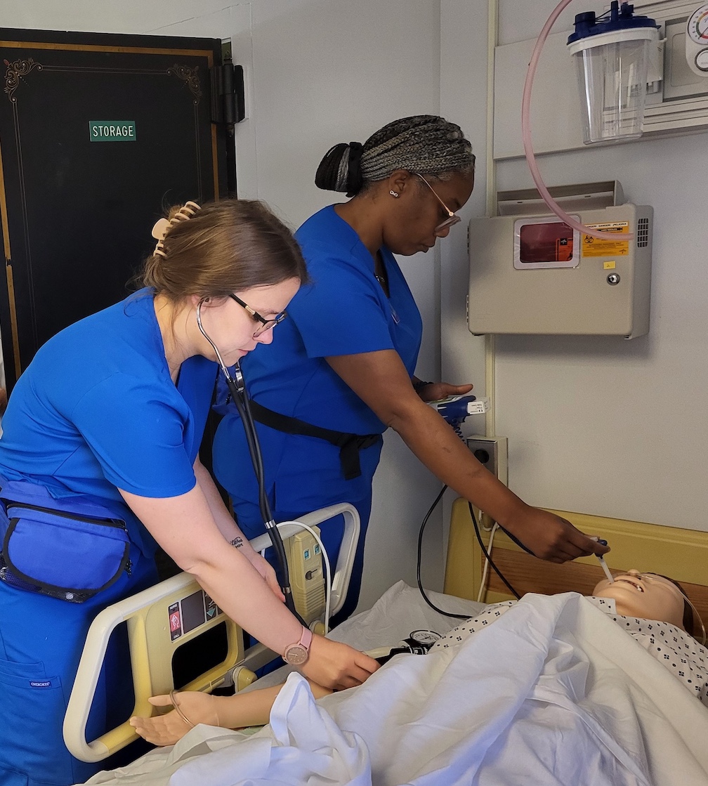 Practical nursing students and student council representatives Abigale Wells and Cherell Roberts-Mosley conduct a thorough assessment on a mannequin in the lab.