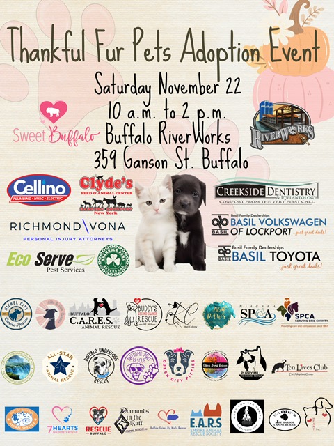 It's that time of year to be thankful for family and friendship – and what better way to celebrate Thanksgiving than to welcome home a new family member at the “Thankful Fur Pets” adoption event happening from 10 a.m. until 2 p.m. Saturday, Nov. 22, at Buffalo RiverWorks!