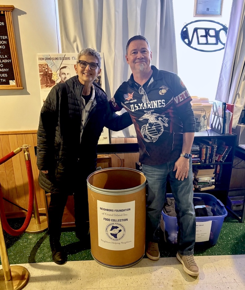 Pictured: Neighbors Foundation board member Annie Carlson and VFW Charles N. DeGlopper Memorial Post 9249 representative Anthony Chase with the Neighbors Foundation food donation barrel at the VFW site.